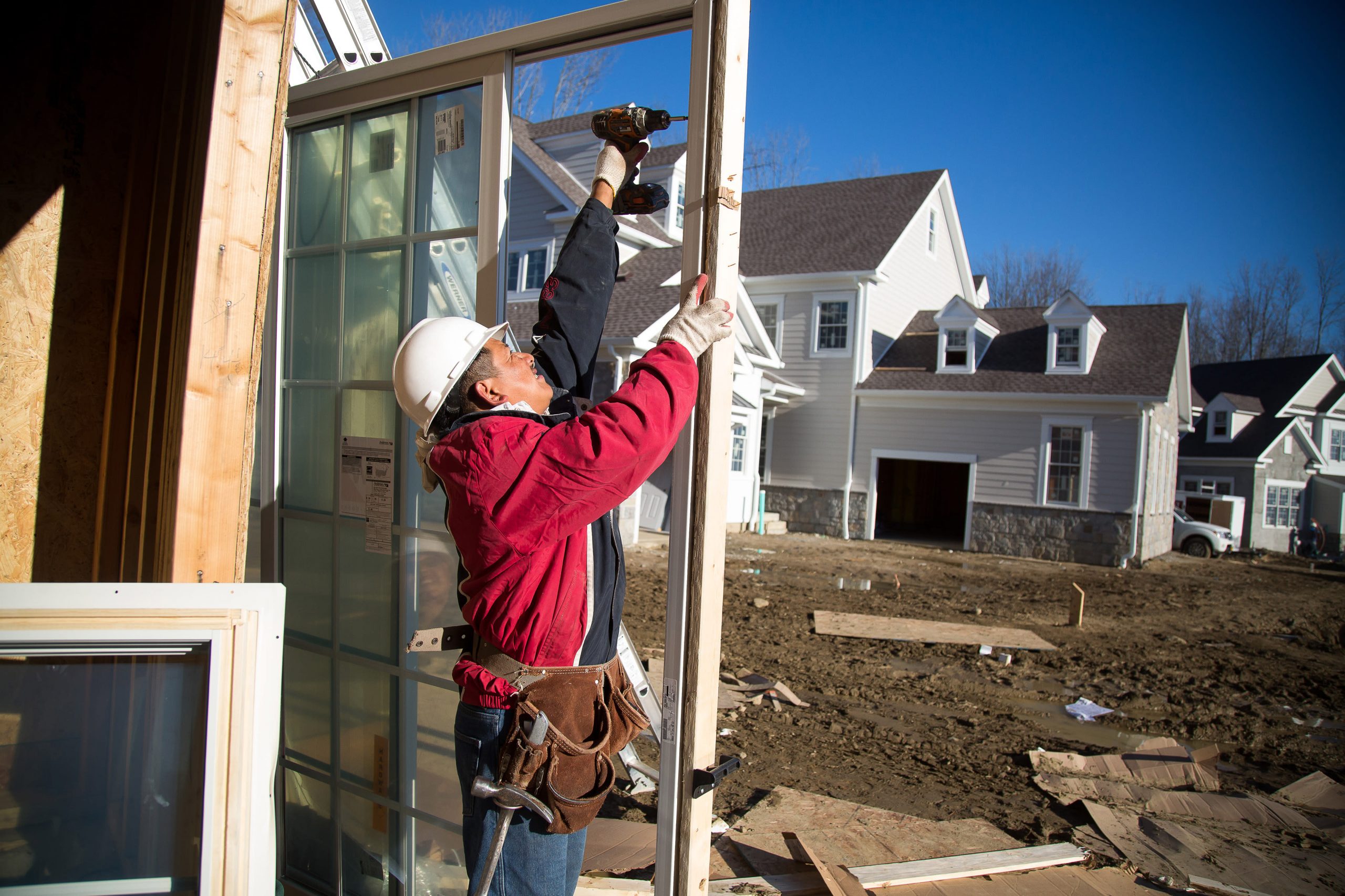 A contractor prepares a sliding door for a home under construction at the Toll Brothers Inc. Enclave at Rye Brook housing development in Rye Brook, New York