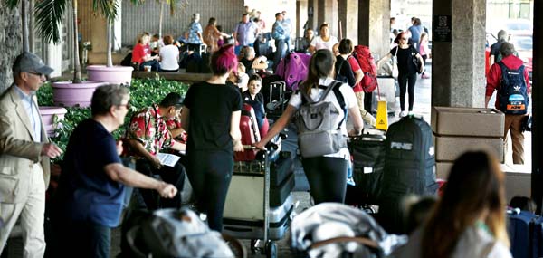 Kahului Airport was bustling with tourists in this recent photo. The county Cost of Government Commission has come up with a draft report examining the county grant to the Maui Visitors Bureau. — The Maui News / MATTHEW THAYER photo