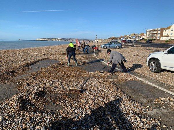 Seaford runners clear shingle covered promenade by hand after storms