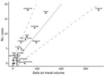 We obtained data on daily air travel from a network-based modeling study (S. Lai et al., unpub. data, https://doi.org/10.1101/2020.02.04.20020479External Link) that reported monthly air travel volume estimates for the 27 locations outside mainland China that are most connected to Wuhan. These estimates were calculated from International Air Travel Association data from February 2018, which includes direct and indirect flight itineraries from Wuhan. For these 27 locations, estimated air travel volumes are >6 passengers/day. We assumed that travel volumes for locations not among the most connected are censored by a detection limit. We used a common method of dealing with censored data from environmental sampling (5), or metabolomics (6), to set the daily air travel volume to half the minimum previously reported. Therefore, we used 3 passengers/day for estimated travel volumes for the 167 locations from the GHS Index not listed by Lai et al. We tested the robustness of our results by using a set of alternative values of 0.1, 1, and 6 passengers/day for the censored data.