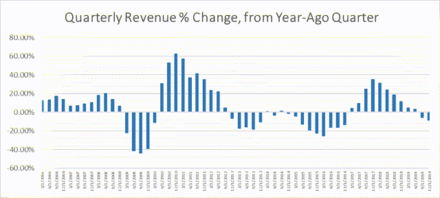 Quarterly revenue for Caterpillar last peaked at $14,432 million in Q2 2019, representing a 23.65% change from Q2 2018. Although quarterly revenues do not show too much of a cyclical pattern, looking at quarterly revenue growth in comparison to the year-ago quarter shows that cyclical nature. Following the recession, Caterpillar’s quarterly revenues grew from $7,298 million in Q3 2009 to $17,243 million in Q4 2011. Following that peak, and subsequent demand issues in Brazil during 2015 and 2016 due to its economic crisis and in China during the beginning of the US trade war, Caterpillar had quarterly revenues declining steadily to $9,160 million in Q3 2016.