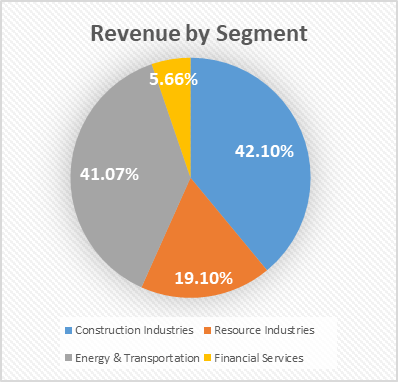 Caterpillar’s business is focused in 2 core parts, machinery and financial services; machinery typically accounts for 94-95% of total revenues, and financial 5-6%. Machinery is composed of three segments – construction industries, resource industries, and energy and transportation. Construction deals with “infrastructure, forestry and building construction [and a] majority of machine sales in this segment are made in the heavy and general construction, rental, quarry and aggregates markets and mining.” Resource serves “mining, heavy construction, quarry and aggregates, waste and material handling applications [with machinery primarily used to] extract and haul copper, iron ore, coal, oil sands, aggregates, gold and other minerals and ores.” Energy and transportation serves “oil and gas, power generation, marine, rail and industrial applications.”