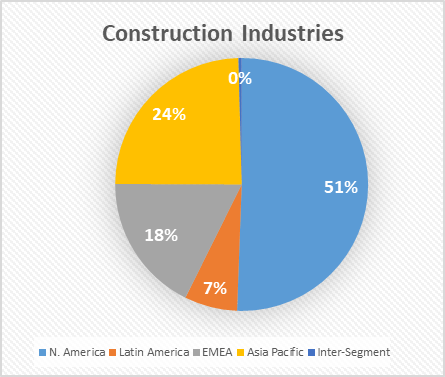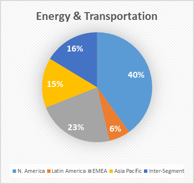 North America and Asia-Pacific account for a majority of revenues in the construction and resource segments, with N. America contributing 51% of total revenues for construction equipment. EMEA comes ahead of Asia-Pacific in energy & transportation, although both are far ahead of Latin America. Inter-segment sales of 16% for energy & transportation were primarily in engines.