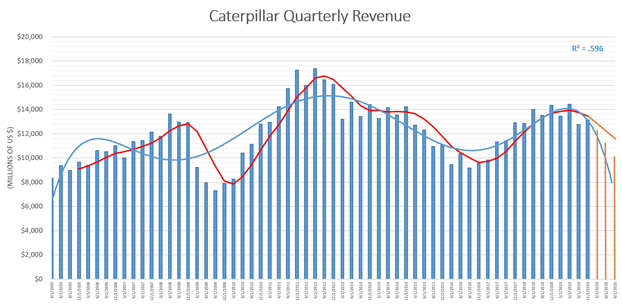 On average, Caterpillar’s quarterly revenue declines in comparison to the year ago quarter last between 5 to 6 quarters. With current YoY quarter changes only at 2 consecutive quarters, Caterpillar could still face 3 to 5 quarters with revenues lower than the year-ago period. Such declining revenues can be predicted on the second graph, with quarterly revenues for the upcoming three quarters plotted in orange. Hypothetical numbers were generated using a 4-period moving average (graphed in and predicted in orange) and a linear regression model. With the model having a variance of .596, predictions for revenue declines were placed closer to the median between the moving average and the regression, so as not to bias predictions in favor of the regression model.