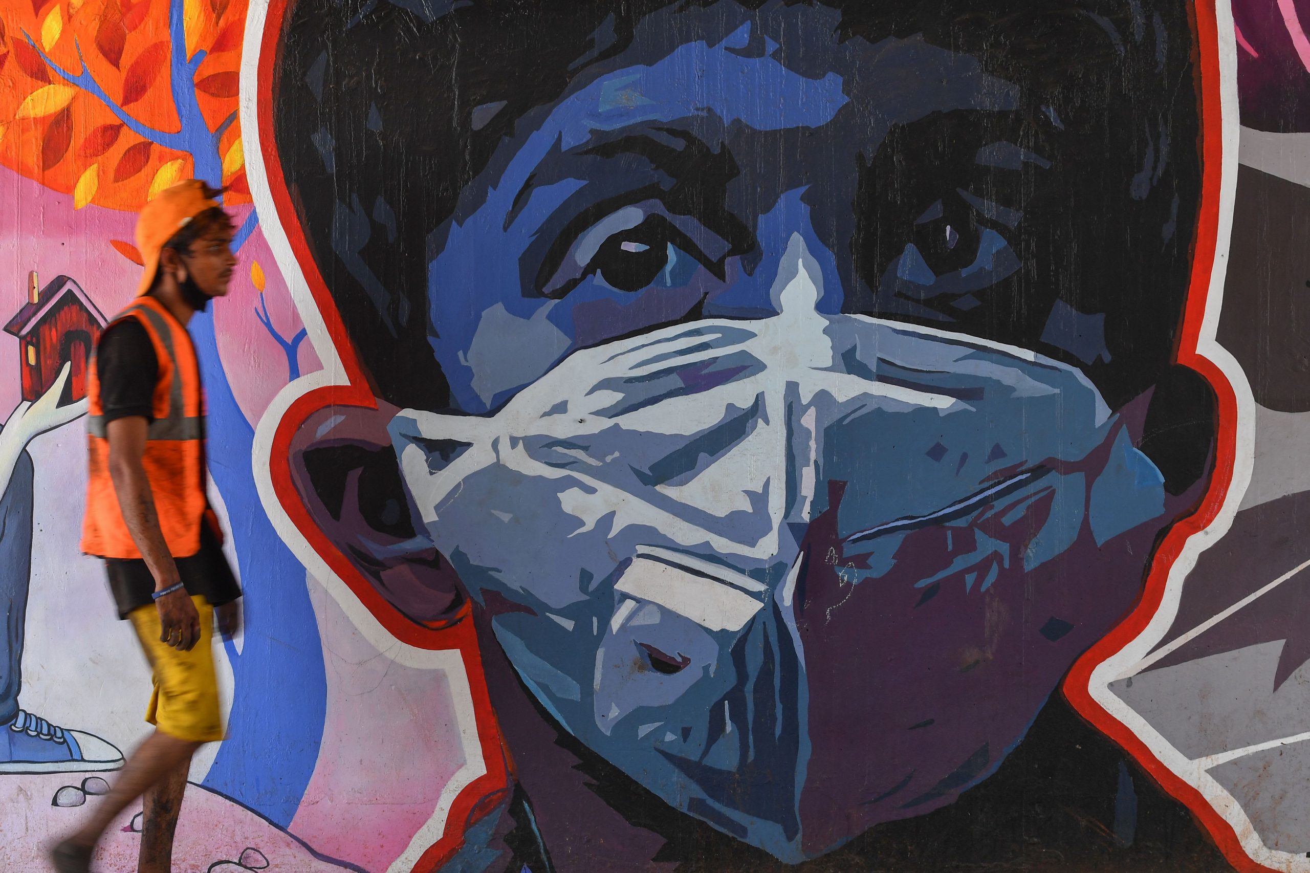 A municipal worker walks past a graffiti of a youth wearing a face mask on May 4, 2020 in Mumbai, India amid a nationwide lockdown to fight against the coronavirus outbreak.