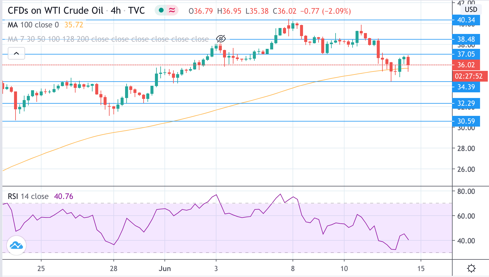 - WTI oil rebound from $34.40 has been capped below the previous support level at $37.18.