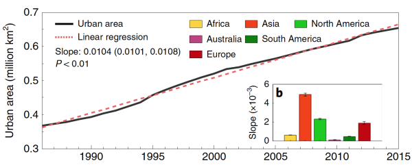 Urban area dynamics during 1985–2015 at the global and continent scales. a, Global urban area dynamics over the past three decades. The data were produced using 30 m resolution Landsat data. The slope is derived from linear regression, with an uncertainty range at the 95th confidence level. b, Slopes of urban area growth over continents. The bottom and upper bounds of the error bars indicate uncertainty ranges (95% confidence interval). Regressions over these continents are all significant with P values <0.01. Liu et al.