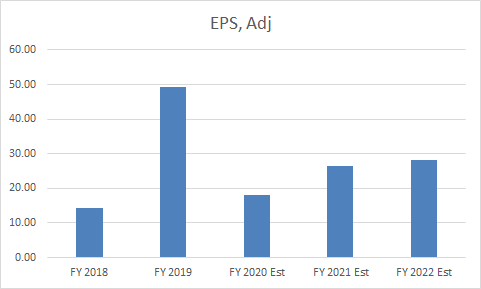 The stock is trading at about 17.5x forward earnings. Its 2-year historical average is only about 1.4 turns higher. EPS estimates for FY20e and FY21e are RMB18.2 and RMB26.5, implying a decline of 63% and an increase of 45% YoY, respectively. EPS 2018-2021e CAGR is estimated to be about 22.6%, which is quite healthy from a longer-term perspective.