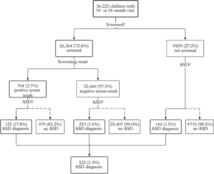 OBJECTIVES: To describe the proportion of children screened by the Modified Checklist for Autism in Toddlers (M-CHAT), identify characteristics associated with screen completion, and examine associations between autism spectrum disorder (ASD) screening and later ASD diagnosis.