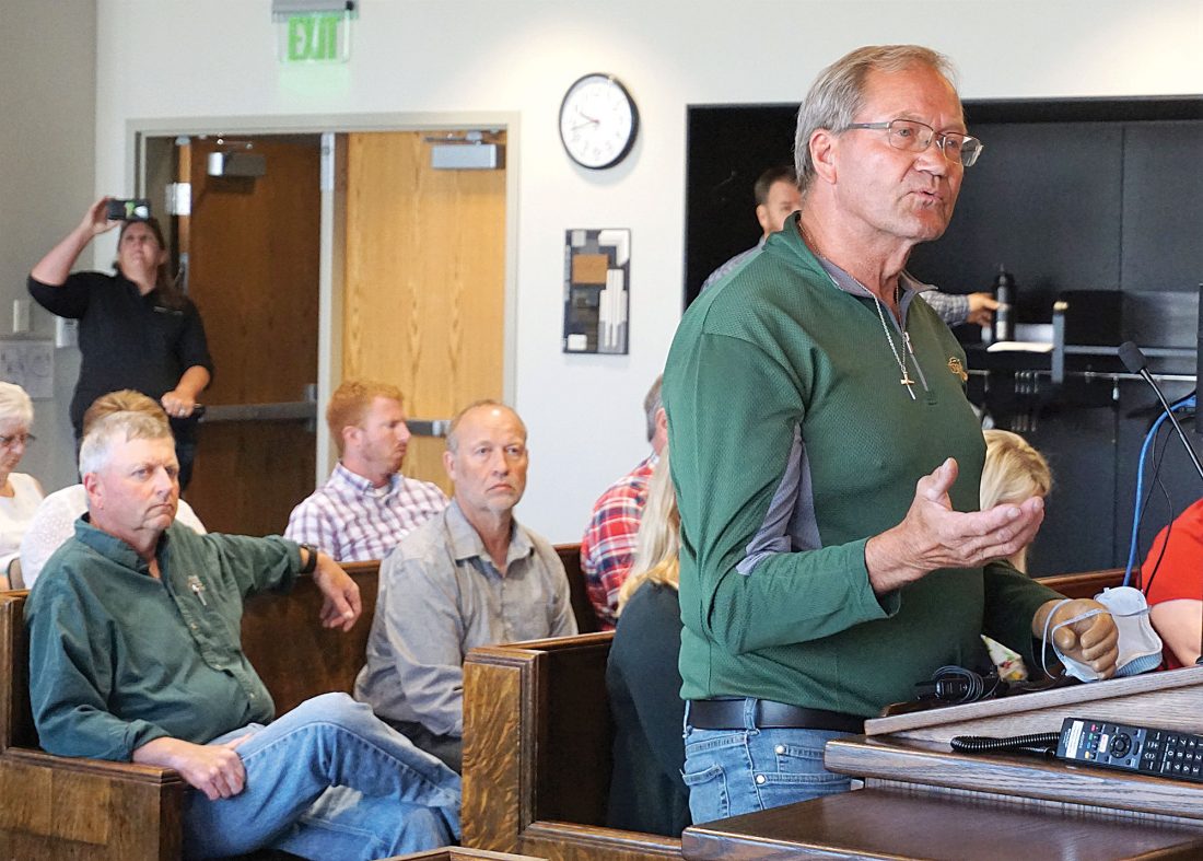 David Miller of Donnybrook addresses the Ward County Commission Tuesday regarding funding for North Central Research Extension Center’s proposed seed plant. Behind him are Mark Birdsall, left, and Troy Coons, who also spoke to support the seed facility.
