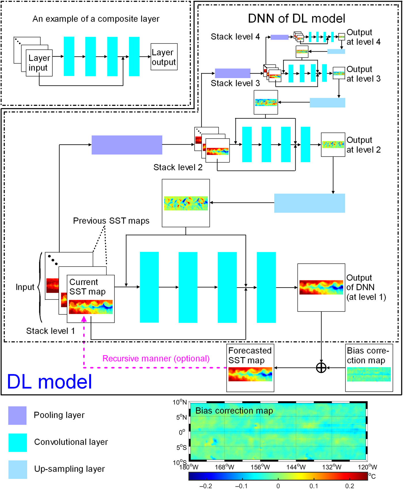 The model consists of a DNN and a time-independent bias correction map, both of which were determined by the samples during the training period. The model receives SST maps at the previous and current time steps and then outputs the SST map at the future time step. The DNN has four stacked composite layers, each of which receives SST maps at different resolutions and has four cascaded convolutional layers. The bias correction map is added to the DNN output to obtain the forecasted SST map.