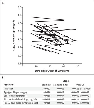 Approximately 80 persons who recovered from Covid-19 referred themselves to our institution to inquire about observational research. Of 68 persons who volunteered to provide initial blood samples, 41 returned to provide repeat samples. Of those persons, 3 were excluded from this analysis because of unclear timing of infection and 4 were excluded because of initial and repeat serum antibody measurements below the limit of reliable quantitative detection. For the 34 participants in our analysis, anti–SARS-CoV-2 receptor-binding domain (RBD) serum IgG concentrations were quantified by enzyme-linked immunosorbent assay as equivalent binding activity to a concentration of a control monoclonal IgG for at least two time points (31 of the 34 participants had two measurements, and the remaining 3 participants had three measurements). Panel A shows log-transformed IgG concentrations plotted against the time since the onset of symptoms in each participant. Panel B shows a linear regression model that was created to estimate the effects of the participants’ age and sex, the days from symptom onset to the first measurement, and the first measured log10 antibody level on the slope reflecting the change in anti-RBD antibody levels (in log10 ng per milliliters per day). The values for age and antibody level were centered at the mean. The time since symptom onset was centered at day 18 and adjusted per 100 days. Thus, the intercept of the model can be interpreted as the average slope adjusted for age, sex, and time and value of the first measurement. CI denotes confidence interval.