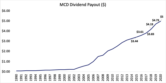 Although MCD has sustained dividends over many years, percentage growth has been inconsistent in many of those years. Thus, we assume that dividends will grow in line with analyst estimates each year over the next 3 years, and will continue to grow at the 5-year dividend CAGR of 7.6% thereafter.