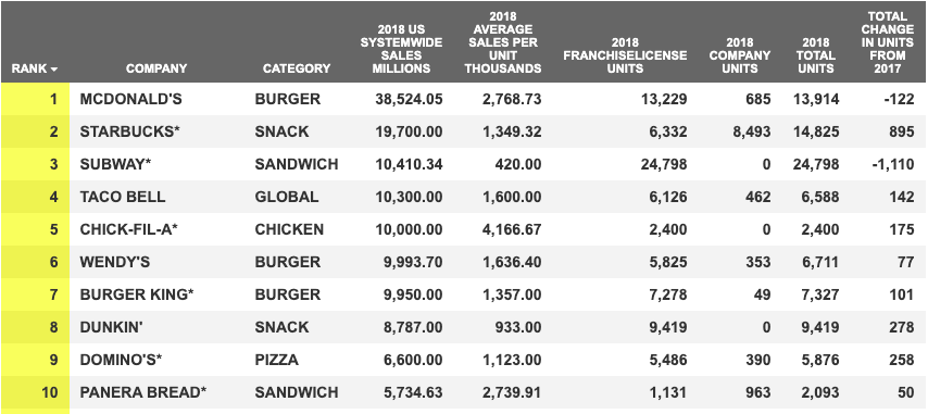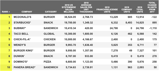 Data Source: QSR Magazine: Ranking The Top 50 Fast-Food Chains In America (2019)