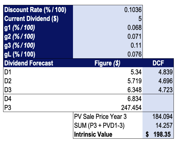 McDonald’s is a mature, stable company paying ongoing dividends for many years, so it is appropriate to utilise a 2-stage dividend discount model alongside analysis of market ratio’s to bolster the valuation of the company. Using the model, we have arrived at a discount rate of 10.97% by summing the opportunity cost of the 10-year mean return from holding the S&P 500 index and the current 10-year US Treasury yield. The opportunity cost of holding the index was preferred over the equity risk premium of 6% secondary to possible inaccuracy due to significant equity market uncertainty at this point in time.