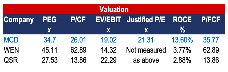 It would be wise to use the EV/EBITDA figure in this sense as well considering the company’s expansion of long-term debt facilities. This stands at 19.02 for MCD, 14.32 for QSR and 22.29 for WEN over the TTM. MCD therefore seems priced in the middle of these 2 securities on this front. Additional valuation metrics are observed below: