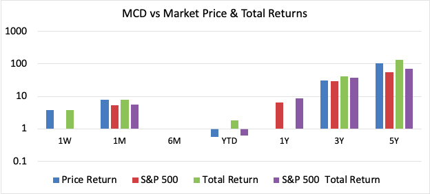 MCD shareholders have realised consistent gains in annual dividend totals for over 40 years with demonstrated CAGR of 7.6% in payouts over the 5-year period to date. Current FWD yield is rated at 2.52%, which is in the 75th percentile of US dividend payers and although not particularly high in absolute terms, is superior to fellow dividend aristocrat heavyweights Nike (NKE) at 1% and Walmart’s (WMT) 1.64%. The FWD yield figure is made more attractive from the company’s proven track record in delivering 136.47% in total returns to shareholders over the past 5 years as a minimum.