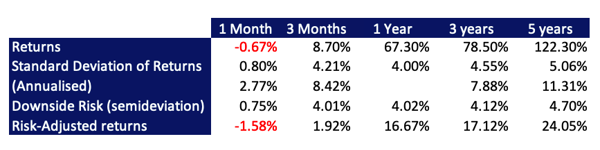 Shareholders have enjoyed returns of ~67% over the single-year period to date, beating the market by 58% on 4.02% risk to the downside in the same period. This presents a compelling case for investors. Additionally, volatility has been stable in the 3-month to 5-year analysis period showing standard deviation of 8-11% (annualised) in this date range, with downside risk in the range of 4.21-5.06%. By comparison, the S&P Pharmaceuticals Select Industry index (SPSIPH) has shown around 25% of volatility defined as a function of standard deviation during this period.