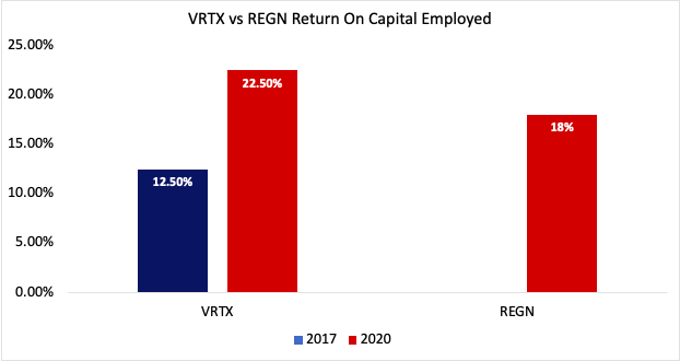 Excess returns can be also be attributed to positive changes in ROCE in the case of Vertex over pure accounting factors, which has demonstrated a move in unison with the stock price. Return on capital employed is a metric contrarian investors such as myself may use to screen for quality in valuation and growth. VRTX has demonstrated 22.5% TTM ROCE, up from 12.5% 3 years ago. These figures are reflected in the price returns shareholders have enjoyed over the same periods. In fact, many companies that show consistent changes in return on capital also register higher valuation over the mid to long term. Bill Miller’s success in charge of the Legg Mason Value Trust was attributed to this very point, for example. Put simply, relying on true “value” indicators alone is subject to a poorer screening strategy as low valuation companies can regularly show low value metrics with equally low ROCE. Consequently, Vertex has shone in this regard, with higher ROCE over peer entity REGN who have managed 18% return on capital, to demonstrate. The case for entry at the current price is further lifted on this sentiment.