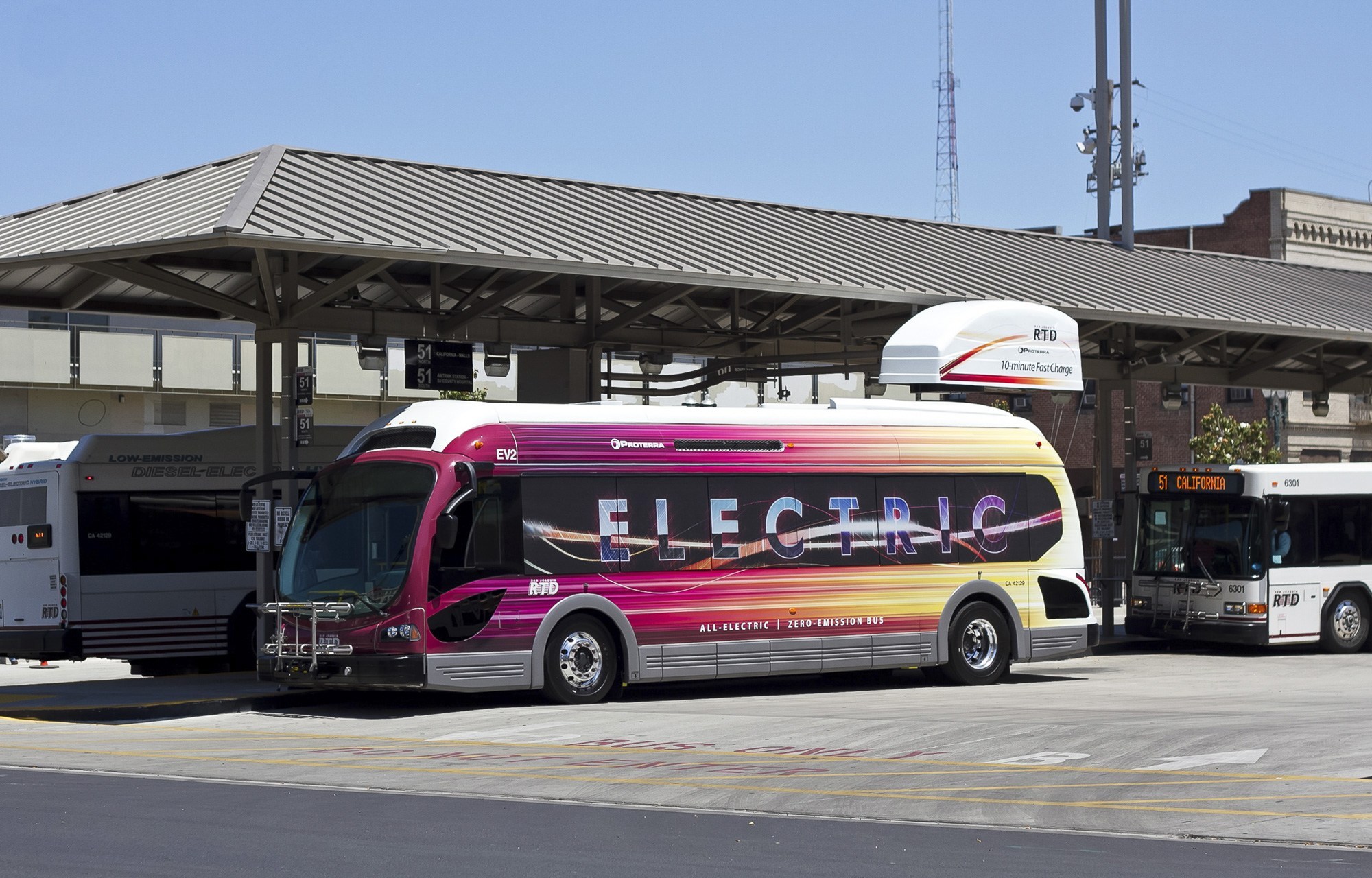 • An all-electric Proterra bus operated by San Joaquin Regional Transit District, shown beside its "Fast Charging" station. Image via Creative Commons. California’s clean-air programs take a hit in new funding cuts.