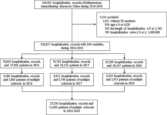This study is based on an administrative database of the National Hospital Quality Monitoring System, which covers all 1665 tertiary hospitals in mainland China. The “Medical Record Homepage” of all patients, including 346 variables including demographic characteristics, diagnoses, procedures, and expenses etc., were uniformly collected across each tertiary hospital via standard protocol. MS was defined by the 2010 International Panel criteria for MS and was identified by ICD-10 code (G35•0).
