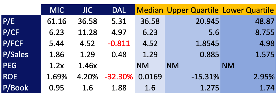 The market has also valued P/Sales for MIC ahead of JCI and DAL at 1.86, so we believe there is an expectation the company will continue to perform, albeit at a reduced capacity from previous times. Charles Lewis Sizemore, CFA, has agreed on this sentiment earlier this year. As well, the above percentile data may be slightly off-put by DAL’s negative metrics recorded from our calculations. Either way, relative to the sector median and in relation to these 2 companies, MIC seems to be trading at a hefty premium from the assumptions of these metrics.