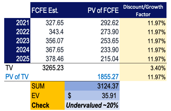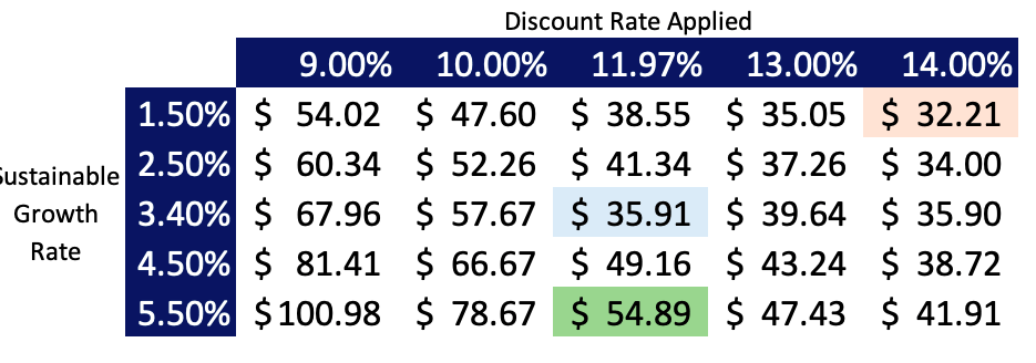 We believe the stock’s undervalued status is correct based on our assumptions, as even if we are wrong in any 2 out of the 3 combinations, it still appears undervalued in a range of $32.41-$54.89, illustrated in the sensitivity analysis over the inputs below.