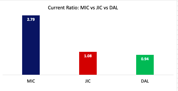 MIC most recently elicited a meager 2.3% ROCE which is also down from 4.41% 3 years ago. This was coupled with ROA of only 1.84% for the quarter and 2.7% for the trailing twelve months, around a -36% decrease over the 3-year period to date. The company’s assets are only generating around 22 cents for every dollar invested in the asset base, which needs to show strength in order for the company to remain profitable and meet the capital project outcomes it has outlined. JCI has returned 3.58% on capital employed with around 2% ROA, whilst DAL have performed poorly, generating 1.48% ROCE and -5.06% ROA, to draw examples for MIC.