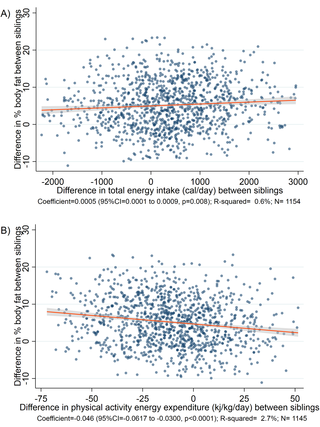 A) Association of difference in energy intake and % body fat between urban migrant and rural sibling. (B) Association of difference in energy expenditure and % body fat between urban migrant and rural sibling.