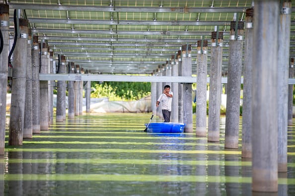 A farmer rowing a boat checks fish under the solar panels at a fishery-solar hybrid photovoltaic power station on August 10, 2020 in Ding’an County, Hainan Province of China.