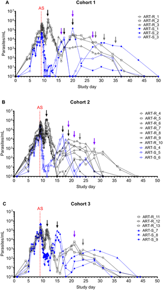 In the pilot study, participants were intravenously inoculated with approximately 2,800 viable ART-R parasite-infected erythrocytes on Day 0. In the comparative study, participants were intravenously inoculated with approximately 2,800 viable ART-R parasite-infected erythrocytes on Day 0, or with approximately 2,800 viable ART-S parasite-infected erythrocytes on Day 1. ART-R infected participants were inoculated a day earlier than ART-S infected participants so that parasites were at a similar stage of development at the time of AS administration (see Results section for more detail). Parasitaemia was monitored by quantitative PCR (qPCR) targeting the P. falciparum 18S rRNA gene [11]. Gametocytaemia was monitored by reverse transcription qPCR (qRT-PCR) for female-specific pfs25 mRNA and male-specific pfMGET mRNA [12].