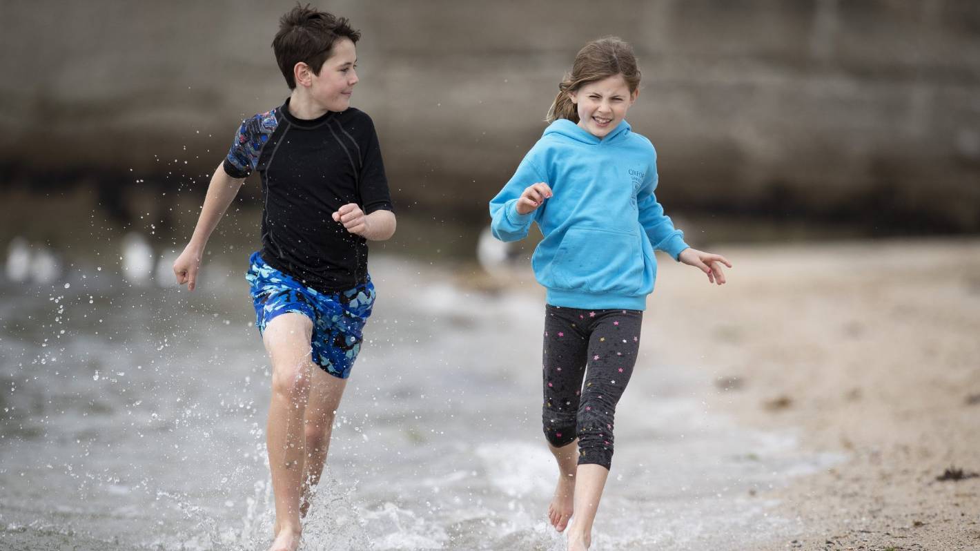 Brother and sister Alex, 10, and Georgina McKenzie, 8, run about in the water on Freyberg Beach in Wellington. New Zealand has been experiencing a milder winter than usual.