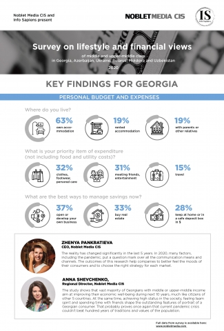 Anna Shevchenko, Regional Director, Noblet Media CIS comments: “The study shows that vast majority of Georgians with middle or upper-middle income aim at improving their economic well-being during next 10 years, much like citizens of other 5 countries. At the same time, achieving high status in society, feeling team spirit and spending time with friends shape the outstanding features of portrait of a Georgian consumer. That probably proves once again that the current pandemic crisis couldn’t beat a hundred years of traditions and values of the population.”