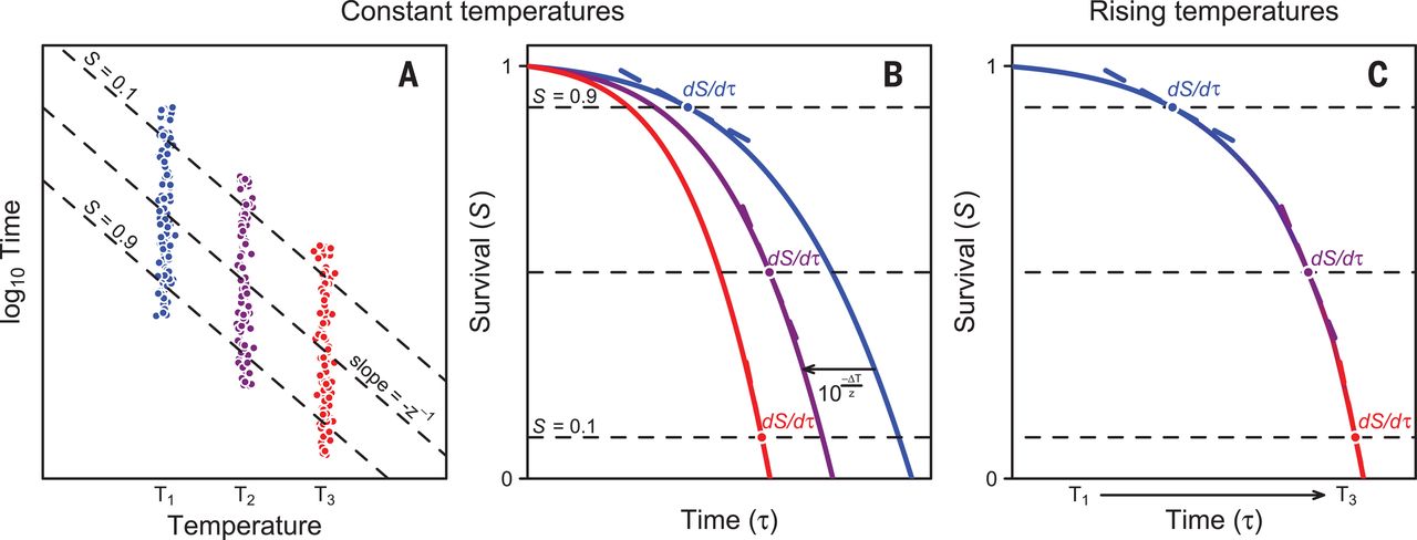 Here, we show that these inconsistencies can be explained with a common theoretical framework, whose main premise is that the cumulative impact of any thermal stress varies with temperature and time. Similar methods are commonly used in the food processing and pest control literature (12, 13), and yet their application in thermal ecology remains contentious [but see (14, 15)]. We previously combined survival probability functions with measurements of elapsed time for thermal death to obtain a continuous “tolerance landscape” at different constant temperatures (16) and now expand this framework to predict survival in a variable environment. The logarithm of survival times varies linearly with temperature (Fig. 1A), and results in parallel thermal death time curves for different relative survivals (S) that can be described with a simple relation between exposure times (τ) and temperature (T):(1)where z > 0 corresponds to the thermal sensitivity describing the ΔT required to change τ one order of magnitude (Fig. 1A and supplementary materials). Thus, if z = 2°C, an organism that tolerates 40°C for 1 min could withstand 38°C for 10 min and 36°C for 100 min. For standardization purposes, hereafter we refer to the temperature at which mean τ = 1 min as Tmax, which corresponds to the temperature at which the linear regression touches the abscissa with log10-transformed τ (Fig. 1A). Equation 1 implies that any survival probability function ST(τ) shifts horizontally by as a consequence of 1°C increase in temperature, and therefore, we can transform any survival probability function from T1 to T2 with the relationship (for notational simplicity, we denote the temperature dependence by lower index):(2)(Fig. 1B). In a variable thermal environment, changes in the survival probability function are coupled to changes in temperature and survival times as(3)(Fig. 1C). The survival rate at any given time τ′ can be calculated by summing up the infinitesimal small changes in the time interval [0, τ′]. This can be accomplished analytically or numerically (supplementary materials).