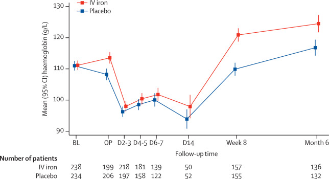 Randomisation was done by trained staff members using a secure web-based service through the Clinical Trials Unit at the London School of Hygiene & Tropical Medicine. The web-based service was provided by an independent research support organisation. Randomisation was 1:1, with allocation concealment that used minimisation, considering baseline haemoglobin (<100 vs ≥100 g/L), age (<70 vs ≥70 years), centre, and operation type (major, major plus, complex major). Because the intravenous iron was a dark-brown solution that is easily distinguishable from the saline placebo, dedicated unblinded study personnel were responsible for the preparation and administration of the study drug but had no other involvement in the trial. To ensure blinding of the participants, their skin was swabbed with iodine, and the study treatment was shielded from vision (light protection bags) and infused through black tubing. Other clinical and research staff were blinded to the treatment allocated.