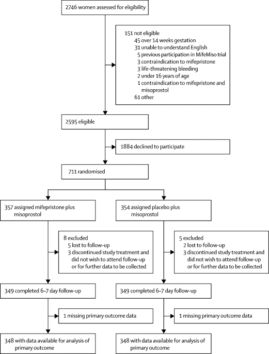 MifeMiso was a multicentre, double-blind, placebo-controlled, randomised trial in 28 UK hospitals. Women were eligible for enrolment if they were aged 16 years and older, diagnosed with a missed miscarriage by pelvic ultrasound scan in the first 14 weeks of pregnancy, chose to have medical management of miscarriage, and were willing and able to give informed consent. Participants were randomly assigned (1:1) to a single dose of oral mifepristone 200 mg or an oral placebo tablet, both followed by a single dose of vaginal, oral, or sublingual misoprostol 800 μg 2 days later. Randomisation was managed via a secure web-based randomisation program, with minimisation to balance study group assignments according to maternal age (<30 years vs ≥30 years), body-mass index (<35 kg/m2 vs ≥35 kg/m2), previous parity (nulliparous women vs parous women), gestational age (<70 days vs ≥70 days), amount of bleeding (Pictorial Blood Assessment Chart score; ≤2 vs ≥3), and randomising centre. Participants, clinicians, pharmacists, trial nurses, and midwives were masked to study group assignment throughout the trial. The primary outcome was failure to spontaneously pass the gestational sac within 7 days after random assignment. Primary analyses were done according to intention-to-treat principles. The trial is registered with the ISRCTN registry, ISRCTN17405024.