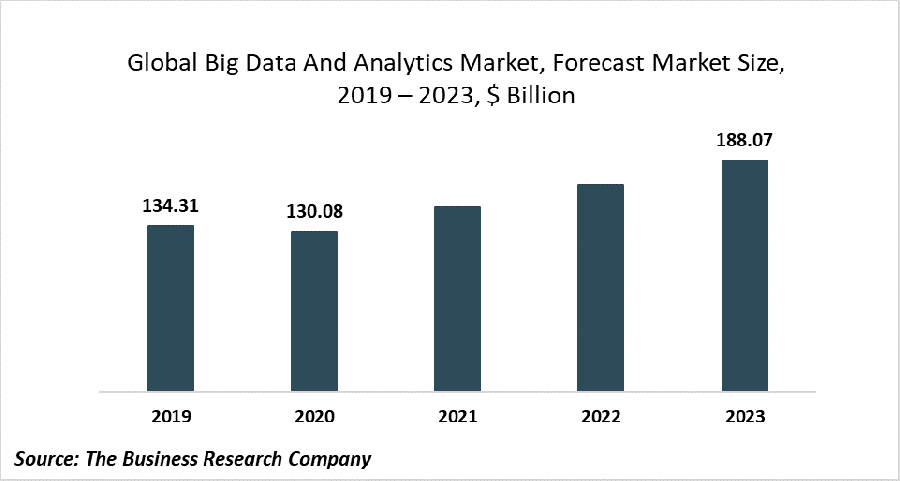 The global big data and analytics market is expected to grow from $134.31 billion in 2019 to $130.08 billion in 2020 at a compound annual growth rate (CAGR) of 2.93%. The decline in growth rate is mainly due to economic slowdown across countries owing to the COVID-19 outbreak and the measures to contain it. The big data and analytics market is then expected to recover and reach $188.07 billion in 2023 at CAGR of 12.99%.