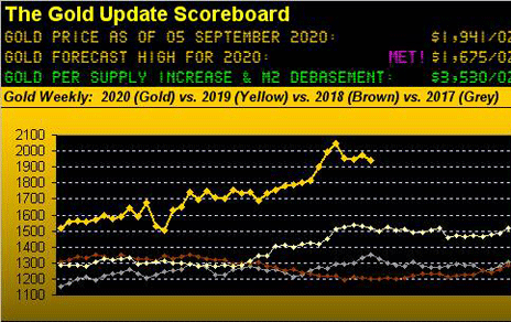 Those two albeit solely technical trends do not bode well at least near-term for Gold, the suggestion being that ’twill be yet another negative Labor Day to Thanksgiving run as has overwhlemingly been the case this decade-to-date. Fortunately however, the ongoing massive mitigant to such negativity is the fundamental fact of Gold’s remaining significantly undervalued vis-à-vis currency debasement, our opening Gold Scoreboard pegging price at the “ought be” level of 3530, some 82% above where it actually settled out the week yesterday (Friday) at 1941. But as we turn to the chart of Gold’s weekly bars, we nonetheless see the second red dot of parabolic Short trend: