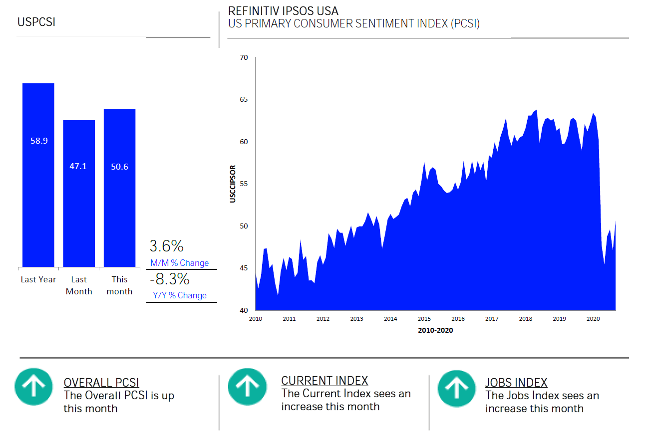 WASHINGTON, DC — Americans’ consumer confidence, as measured by the Refinitiv/Ipsos Primary Consumer Sentiment Index, is at 50.6 for the month of September 2020, up 3.6 points from last month (47.1).