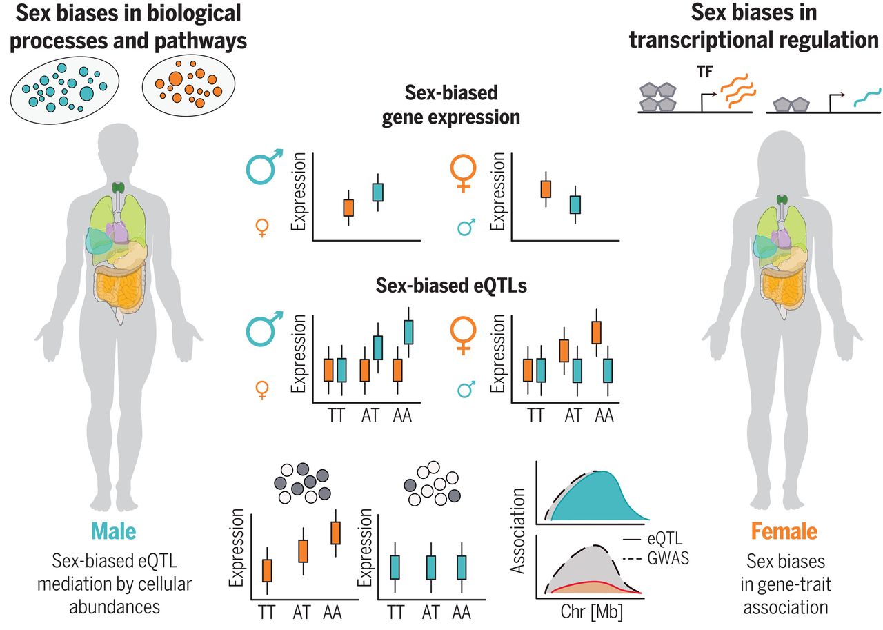 In humans, the inheritance of the XX or XY set of sex chromosomes is responsible for most individuals developing into adults expressing male or female sex-specific traits. However, the degree to which sex-biased gene expression occurs in tissues, especially those that do not contribute to characteristic sexually dimorphic traits. is unknown. Oliva et al. examined Genotype-Tissue Expression (GTEx) project data and found that 37% of genes in at least one of the 44 tissues studied exhibit a tissue-specific, sex-biased gene expression. They also identified a sex-specific variation in cellular composition across tissues. Overall, the effects of sex on gene expression were small, but they were genome-wide and mostly mediated through transcription factor binding. With sex-biased gene expression associated with loci identified in genome-wide association studies, this study lays the groundwork for identifying the molecular basis of male- and female-based diseases.