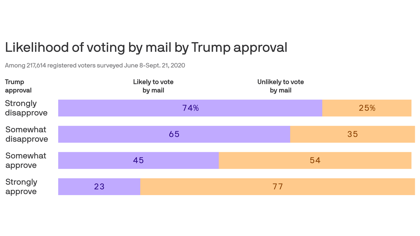 Voters who disapprove of President Trump most strongly are by far the most likely to vote by mail in the presidential election, according to an Axios analysis of exclusive data from SurveyMonkey and Tableau.