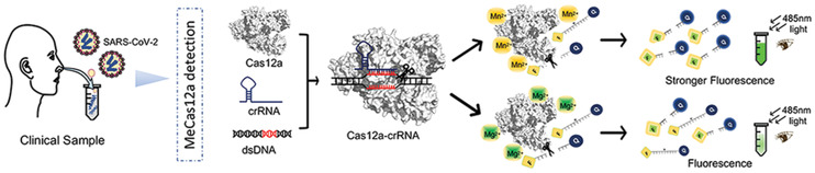 The detection assays were performed as previously reported with minor modifications.[11] In a 20 µL detection assay, with 200 ng LbCas12a protein, 25 × 10−12 m ssDNA FQ probe sensor, 1 × 10−6 m crRNA, and 2 µL of the sample in a reaction buffer (100 × 10−3 m NaCl, 50 × 10−3 m Tris‐HCl, 100 µg mL−1 BSA(bovine serum albumin), pH 7.9) supplied with 10 × 10−3 m MgCl2 or MnSO4, were incubated at 37 °C until detection. A PerkinElmer EnSpire reader with the excitation at 485 nm and emission at 520 nm was used for fluorescence detection. The naked‐eye determination was taken under 485 nm light and photographed with a mobile phone. For the divalent‐ion preference screen, the detection assay was supplemented with 10 × 10−3 m EDTA (Ethylenediaminetetraacetic acid), EGTA (Ethylene glycol tetraacetic acid), CaCl2, CoCl2, CuSO4, FeSO4, NiSO4, MgSO4, MnSO4, or ZnSO4.