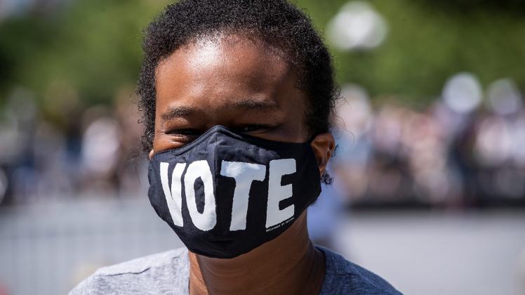 Top Image: An African American protester wearing a mask that says, “Vote” in Washington Square Park expressing the sentiment that voting in November 2020 will be a way to help affect change in policies to end racial injustice. Photographed in the Manhattan Borough of New York on June 19, 2020, USA. | Ira L. Black/Corbis via Getty Images