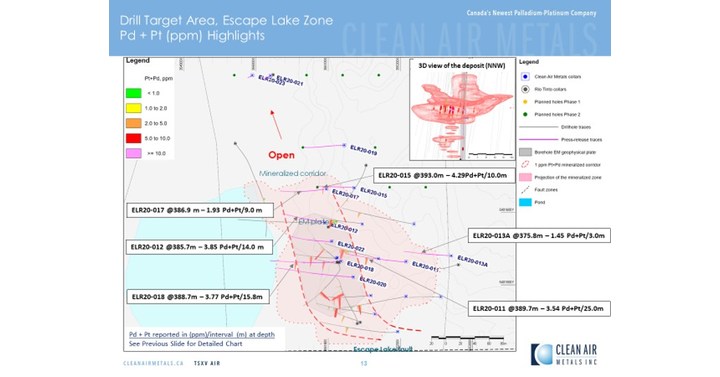 Abraham Drost, CEO of Clean Air Metals stated that “the assay results from Hole ELR20-011, 012, 13A, 15, 17 and 18 broaden the Escape Lake deposit laterally into a larger lens of mineralization that appears to be “ponded up” against the Escape Lake Fault to the south.