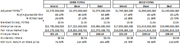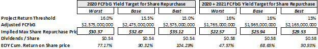 Equivalently, this would imply (see below) a share repurchase target of between a minimum of $22.57/share and a maximum of $29.53/share based on 2021E FCFbG (in line with prior statements by the CEO advocating for a share repurchase program when the shares were trading at ~$22 per share):
