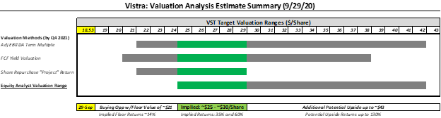 Another alternative valuation technique is to look at Free Cash Flow before Growth Capex (“FCFbG”) yields. Since FCFbG yields are not expected to decrease in the foreseeable future beyond 2021, we can estimate VST valuation based on an analysis of its Forward 2021E FCF Yield of ~20%+ and current Blended EV/ FCFbG trading multiples. From this analysis, the target minimum FY 2021 share price would range from a minimum of ~$21.19/share to a maximum of ~$38.63/share: