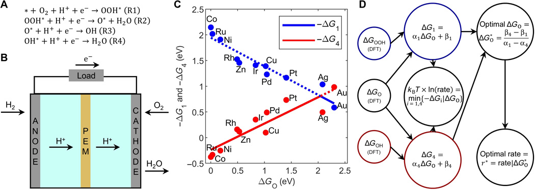 (A) Key reaction steps (R1 to R4) in hydrogen fuel cells. R1, solvated O2 forms adsorbed OOH*; R2, OOH* forms adsorbed surface oxygen O* and solvated H2O; R3, O* forms adsorbed OH*; R4, H2O forms and regenerates the free catalyst site. Asterisk (*) represents an unoccupied metal site or an adsorbed species; H+ and e− refer to proton and electron, respectively. (B) Schematic of a hydrogen fuel cell. (C) Negative changes in Gibbs energies (−ΔG1 and −ΔG4) for reactions R1 (blue) and R4 (red) on the close packed (111/0001) surface of face-centered (fcc) and hexagonal close-packed (hcp) metals for the most stable sites of OOH*, OH*, and O* computed (specifically for this work) via DFT (circles) and linear regressions (lines). The optimal oxygen free energy ΔGO* is the intersection of the two lines. The min{ − ΔG1, − ΔG4}, indicated by the solid lines, determines the rate, estimated using Eq. 1. The optimal rate occurs at ΔGO*. (D) Deterministic “human” workflow for obtaining the optimal formation energy of surface oxygen and the rate of the ORR.