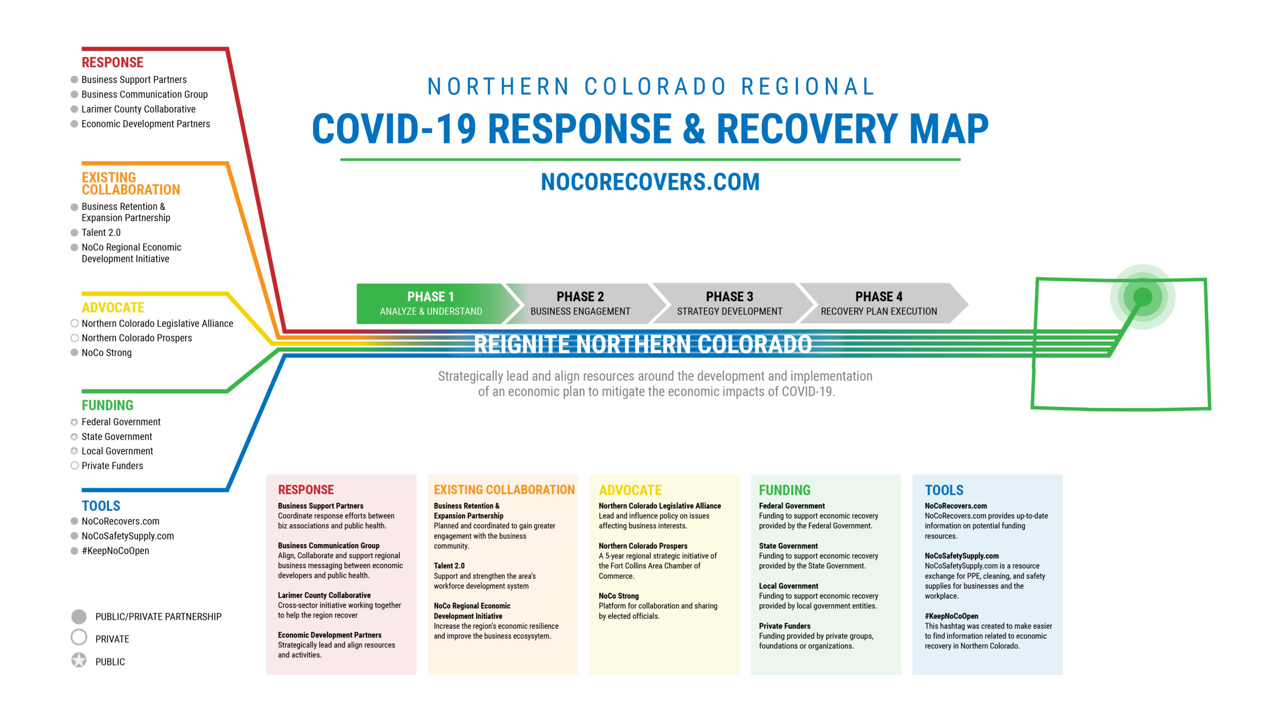 The Northern Colorado Regional COVID-19 Response & Recovery map serves as a visual representation that highlights the alignment of resources and mitigation work that has been implemented in response to the economic impacts of the COVID-19 pandemic. The map includes existing collaborations before COVID-19 that are still working together to mitigate impacts, businesses response partners and groups, advocacy organizations, funding opportunities, and regional tools.
