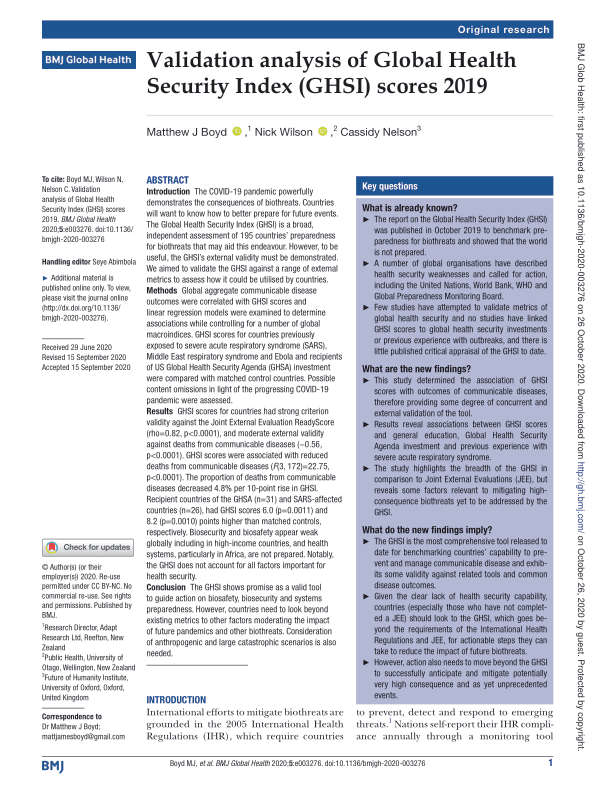 The GHSI shows promise as a valid tool to guide action on biosafety, biosecurity and systems preparedness. However, countries need to look beyond existing metrics to other factors moderating the impact of future pandemics and other biothreats. Consideration of anthropogenic and large catastrophic scenarios is also needed.