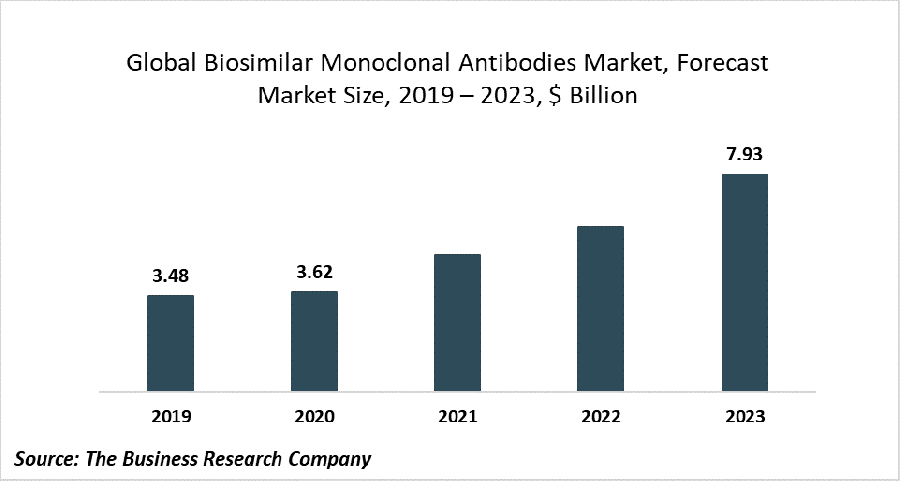 The global biosimilar monoclonal antibodies drug market size is expected to decline from $3.48 billion in 2019 to $3.62 billion in 2020 at a compound annual growth rate (CAGR) of 3.93%. The slow growth rate is mainly due to the COVID-19 outbreak that has led to restrictive containment measures involving social distancing, remote working, and the closure of industries and other commercial activities resulting in operational challenges. The global biosimilar monoclonal antibodies drug market share is then expected to recover and reach $7.93 billion in 2023 at a CAGR of 29.91%.